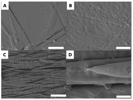 The vertical microhairs were observed at different magnifications (Figure 10A–D). Scanning electron microscopy images revealed a very interesting structure. The microhairs appear to be covered by horizontally aligned nanogrooves. (Figure 10C,D). These structures have been regularly observed in nature, particularly on species with the ability to harvest water which have developed structures, such as the cactus spines, for the directional movement of water droplets [23,24,25,26].