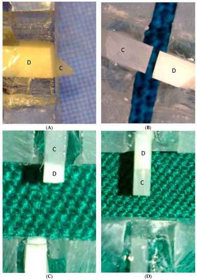 Modes of failure of the experimental groups. (A) Mixed failure; (B) adhesive failure; (C) cohesive failure of dentin; (D) cohesive failure of composite. C: Composite; D: Dentin.