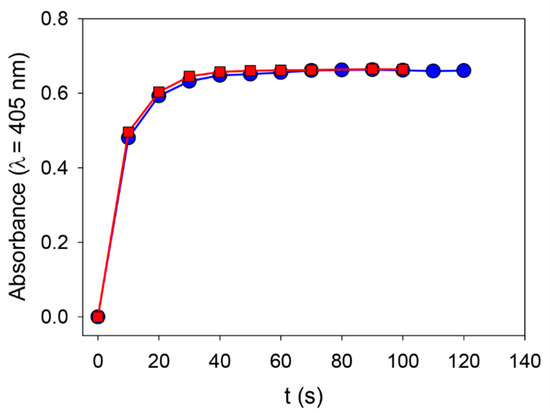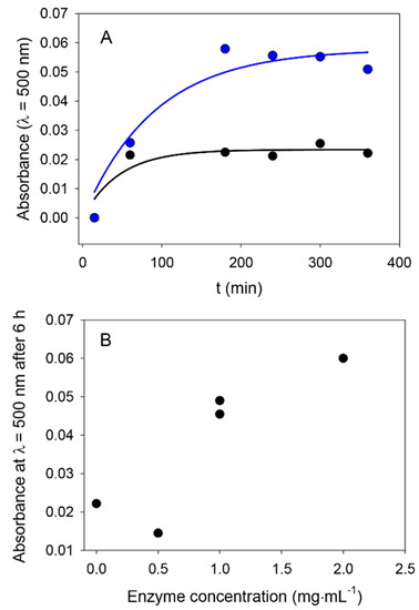 From a more quantitative point of view, we investigated the kinetics of the formation of nanoparticles in the presence, and in the absence, of ALP by UV–vis spectroscopy. An illustrative experiment is shown in Figure 1, where it appears that ALP present at a concentration of 0.5 or 1 mg∙mL−1 is able to produce PDA aggregates faster than in the absence of the enzyme from a 2 mg∙mL−1 dopamine solution, compared to the reference case in the absence of enzyme. These results are similar to those obtained for dopamine in the presence of ALP, but at pH 8.5 in the absence of another added oxidant [28]. This increase in the oxidation rate of dopamine in the presence of ALP is also similar to the influence found for HSA, but at pH 8.5 in the presence of dissolved oxygen as the oxidant [26].