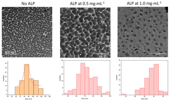 Even more interesting is the zeta potential reversal in the presence of ALP: pristine PDA displays a positive zeta potential at pH 5.0 in agreement with the zeta potential of PDA films produced by auto-oxidation of dopamine (but at pH 8.5), whereas PDA@ALP displays a negative zeta potential around −20 mV at pH 5.0. This finding is in agreement with the observation that ALP is present in the corona of the obtained nanoparticles (Figure 3). Indeed, the zeta potential of an ALP solution at 1 mg∙mL−1, in the presence of Tris buffer, is equal to −25 ± 5 mV.