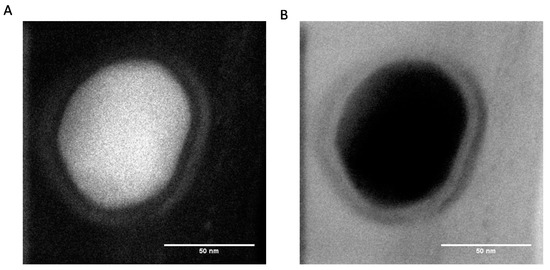 The TEM micrographs obtained at higher resolution show the presence of an external corona less dense than the core of the particles, suggesting that the composition of the external part of the particles is richer in protein than the core (Figure 3).
