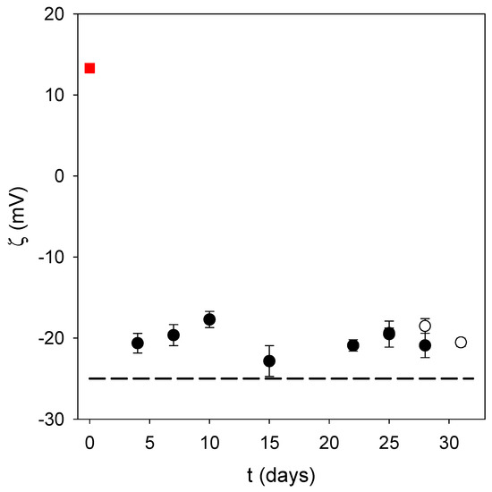 Regardless, it appears that oxidation of dopamine in the presence of ALP in acidic conditions and using NaIO4 as the oxidant allows the small nanoparticles to be produced in a much faster way than at pH 8.5 under auto-oxidation conditions. This is a major advantage provided that the obtained nanoparticles are stable, and are of use for biological applications. Indeed, the obtained PDA@ALP nanoparticles were stable from a colloidal point of view, with no sedimentation during weeks, as observed visually, and a stable zeta potential during storage time (Figure 4). In addition, the zeta potential of the PDA@ALP nanoparticles was markedly different from the zeta potential of the large nanoparticles obtained in the absence of enzyme. The zeta potential of the pristine particles prepared in the presence of NaIO4 as the oxidant (in the presence of sodium acetate buffer at pH 5.0) is different from the zeta potential of the particles prepared using O2 as the oxidant directly in the presence of the Tris buffer (+(20 ± 3) mV). This difference may originate from the influence of NaIO4 on the composition and the structure of the obtained polydopamine. Indeed, NaIO4 is not only an efficient oxidant to oxidize dopamine, yielding almost exclusively dopaminochrome as a PDA precursor, but an oxidant strong enough to degrade PDA and to enrich its composition in carboxylate groups, as shown by means of infrared and X-ray photoelectron spectroscopy [11].