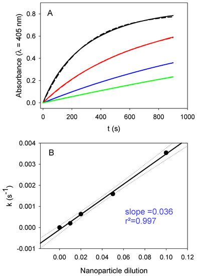 Influence of the dilution of PDA@ALP nanoparticles on their enzymatic activity. (A) Hydrolysis of 10-fold diluted PNP solutions in the presence of PDA@ALP nanoparticles at different dilutions: mother suspension issued from the synthesis and dialysis-diluted 10- (____), 20- (____), 50- (____), and 100-fold (____). The solid lines correspond to the experimental data, whereas the dashed lines correspond to the fit of Equation (1) to the experimental data. (B) Rate constant obtained by fitting Equation (1) to the experiments displayed in (A) versus the nanoparticle dilution factor.