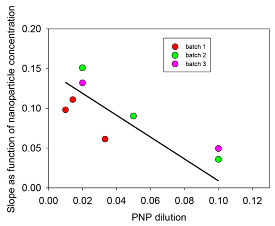 Evolution of the slope of the curves shown in Figure 7B as a function of the PNP dilution (mother solution at (4.6 ± 0.4) × 10−4 mol∙L−1) for three independent batches of PDA@ALP nanoparticles. The solid line does not correspond to a fit, but is aimed to guide the eye.