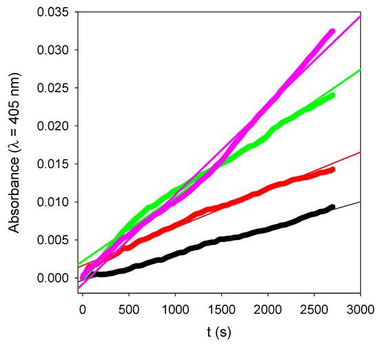 Enzymatic kinetics for (PAH-PDA@ALP)n films put in contact with a 20-fold diluted PNP solution as a function of the number of deposited layer pairs: n = 3 (__⬤__), n = 6 (__⬤__), n = 12 (___⬤___), and n = 15 (__⬤__). The data points correspond to the experimental data, whereas the solid lines correspond to linear regressions of the data.