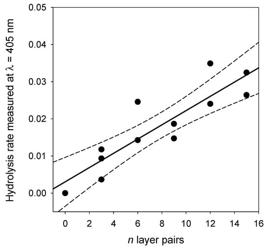 Evolution of the hydrolysis rate of (PAH-PDA@ALP)n films as a function of the number of deposited layer pairs. The solid line corresponds to a linear regression of the data points, whereas the dashed lines correspond to the limit of the 95% confidence interval.