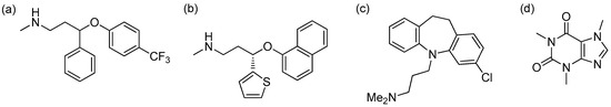Chemical structure of (a) (±)-fluoxetine, (b) (S)-duloxetine, (c) clomipramine, and (d) caffeine.