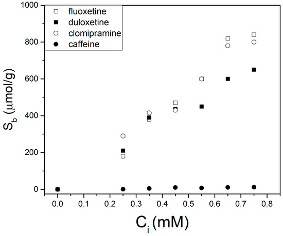 Caffeine is substantially different in structure from the other compounds, and thus shows minimal binding to MIP-2. This is clear from Figure 2, where binding does not exceed 20 µmol/g for caffeine whereas the other compounds all bind more than 600 µmol/g. Binding of fluoxetine at Ci = 0.75 was equal to ≈800 µmol/g, similar to the results obtained to clomipramine. The fact that clomipramine (bearing a tertiary amine) behaves the same as fluoxetine (provided with a secondary amine) suggests that binding may not only be caused by H bonding but also by other noncovalent interactions. The binding of duloxetine at lower initial concentrations is similar to both these two compounds, but the overall binding capacity of ≈600 µmol/g is slightly lower. The reason for this could be that these compounds share a similar pharmacophore, and the main interaction of the functional monomer is with the nitrogen.