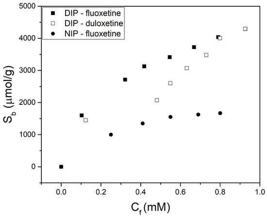 Optical batch rebinding experiments were evaluated by measuring absorbance values (λmax = 264 nm) of the solutions with an Agilent 8453 spectrophotometer (Stockport, UK). For each experiment, MIP or NIP powder (10 mg) was added to several solutions of antidepressants in PBS (5 mL) with different known concentrations. The resulting suspensions were placed on a STUART SSM1 orbital shaker (Cole-Palmer, Stone, UK) at 125 rpm for 90 min and passed through 0.45 µm filters prior to UV–Vis analysis.
