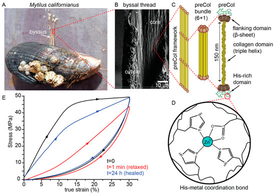 - Reinecke, A.; Bertinetti, L.; Fratzl, P.; Harrington, M.J. Cooperative behavior of a sacrificial bond network and elastic framework in providing self-healing capacity in mussel byssal threads. J. Struct. Biol. 2016, 196, 329–339. [Google Scholar] [CrossRef] [PubMed]
