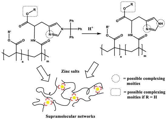 - Enke, M.; Bode, S.; Vitz, J.; Schacher, F.H.; Harrington, M.J.; Hager, M.D.; Schubert, U.S. Self-healing response in supramolecular polymers based on reversible zinc–histidine interactions. Polymer 2015, 69, 274–282. [Google Scholar] [CrossRef]