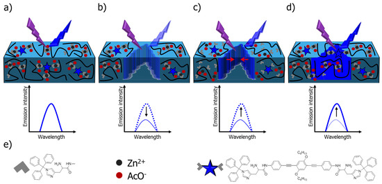 - Ahner, J.; Pretzel, D.; Enke, M.; Geitner, R.; Zechel, S.; Popp, J.; Schubert, U.S.; Hager, M.D. Conjugated oligomers as fluorescence marker for the determination of the self-healing efficiency in mussel-inspired polymers. Chem. Mater. 2018, 30, 2791–2799. [Google Scholar] [CrossRef]