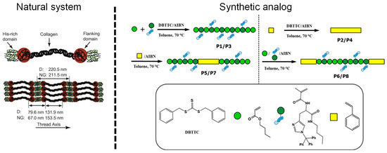 - Enke, M.; Bose, R.K.; Zechel, S.; Vitz, J.; Deubler, R.; Garcia, S.J.; van der Zwaag, S.; Schacher, F.H.; Hager, M.D.; Schubert, U.S. A translation of the structure of mussel byssal threads into synthetic materials by the utilization of histidine-rich block copolymers. Polym. Chem. 2018, 9, 3543–3551. [Google Scholar] [CrossRef]