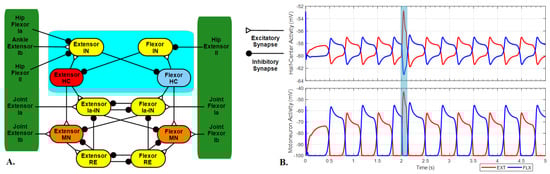 - Shevtsova, N.A.; Rybak, I.A. Organization of flexor–extensor interactions in the mammalian spinal cord: Insights from computational modelling. J. Physiol. 2016, 594, 6117–6131. [Google Scholar] [CrossRef] [PubMed]