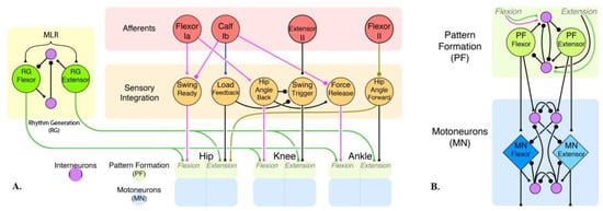 The conceptual neural circuit for a single limb (Figure 2A) builds on our previous models [8,9]. Each joint has an independent control network (Figure 1A and Figure 2B) that manages the pattern activity of motoneurons. That is the extent of our previous work. In this new model, the half-center oscillators act as pattern formation layers, which are only responsible for reshaping the timing signals and managing motoneuron activation. We have added a rhythm generator network as a four-neuron half-center oscillator to generate swing–stance rhythm. This network synapses onto every pattern formation layer in the limb, helping to regulate timing. In our model, we use relatively few non-spiking neurons to represent populations of spiking neurons. The network consists of leaky-integrator neuron models. The dynamics of which are described by the differential equations [27]: