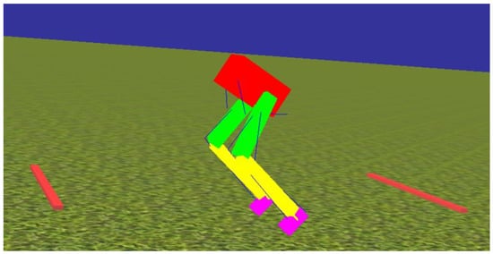 All the modeling and simulation was performed in Animatlab [28]. The biomechanical model reconstruction is limited to motion in the sagittal plane for the rat hindlimbs, resulting in six actuated degrees of freedom, three for each hindlimb (hip, knee, and ankle), and three unactuated degrees of freedom (the forward and vertical translation, and pitch angle of the pelvis). To improve simulation and calculation speed, the biomechanical model was simplified by reducing the complexity of segment shapes (Figure 3). Instead of loading rat bone files scanned from X-ray images as previously described [8,26], the pelvis (red), femur (green), tibia (yellow), and foot (purple) were constructed with simple box models. This resulted in the simulation running four times faster. The length, weight, and density of the bones, and the insertion points and properties of muscle are the same as in our previous biomechanical model. Similar to our previous work [8], two bars, one in front and one in back, support the body during simulated walking experiments.