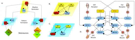 Synthetic nervous system. (A) Single limb control hierarchy. (B) Rhythm generator configuration. (C) Pattern formation network. (D) Sensory-motor network. AD: Adaptor; EXT: Extensor; FLX: Flexor; IN: Interneuron; PF: Pattern formation; RE: Renshaw cell; RG: Rhythm generation.