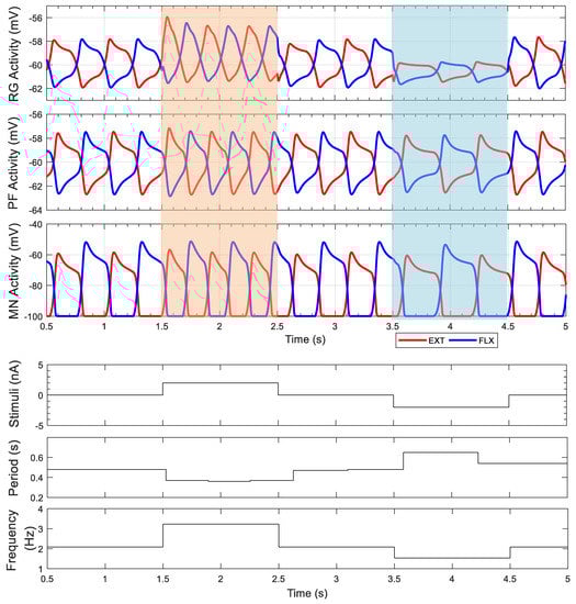 The result of external stimulus to the rhythm generators demonstrates that rhythmic periods can be modulated with minimal influence on the motoneuron activation amplitudes. When a positive electrical current is applied to both rhythm generator neurons (orange area in Figure 5), the period of one stride is shortened from 0.5 to 0.35 s. After the excitatory stimulus is removed, the period immediately returns to 0.5 s. When negative electrical current is applied to both rhythm generator neurons (blue area in Figure 6), the cycle period is prolonged to 0.65 s per period. The cycle period is calculated using MATLAB (MATLAB 2017b, The MathWorks, Inc., Natick, MA, USA). Each new period begins when the extensor pattern formation neuron voltage, , crosses a threshold (i.e., and ).
