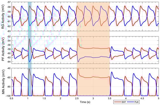 Rhythm generator performance under different conditions. Excitatory stimulus applied from 1.5 to 2.5 s (orange area) with a current of 2 nA. Inhibitory stimulus applied from 3.5 to 4.5 s (blue area) with a current of −2 nA. Both stimuli applied to extensor and flexor rhythm generator neurons simulate descending signals from the midbrain locomotor region. The simulation startup transient, corresponding to the first 0.5 s is not shown. EXT: Extensor; FLX: Flexor; MN: Motoneuron; PF: Pattern formation; RG: Rhythm generation.