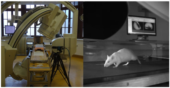 (Left) Workspace and Siemens Neurostar X-ray fluoroscope. (Right) Recording of a rat walking on the treadmill.