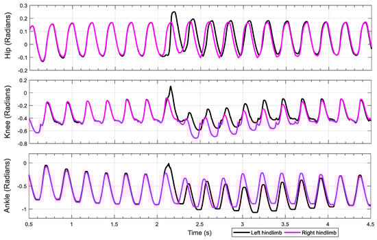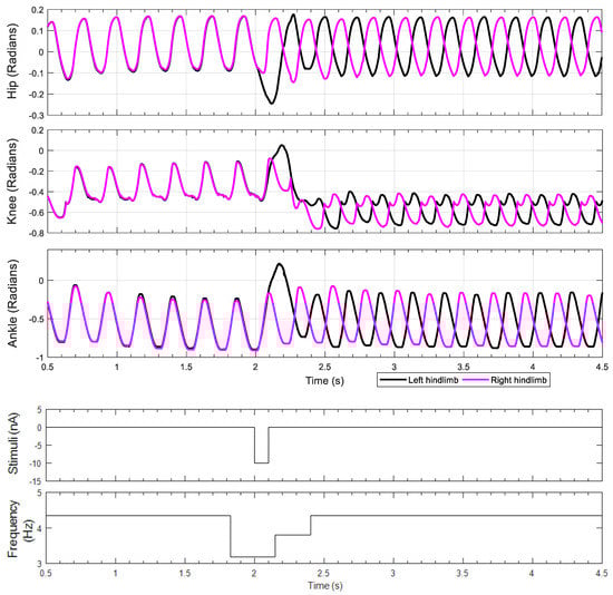 Inhibiting the extensor neuron of the rhythm generator layer (RG EXT in Figure 4B) should result in permanently altering the walking rhythm. Our results confirm this; when the inhibiting stimulus is applied to the extensor neuron of the rhythm generator, the rat produces a prolonged stance phase in the left hindlimb (Figure 10, t = 2 s, top plot, in black), and the walking rhythm is permanently altered. This switches the gait from hopping to alternating stepping, despite there being no neural connections between the hindlimbs. Another interesting result of this change in gait is that the range of motion of the knee joint changes as well due to mechanical feedback within the system.