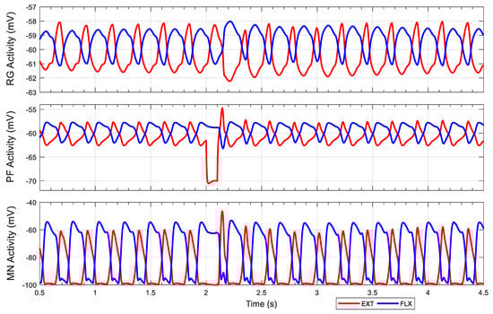 Neuron activities during non-resetting experiment. Inhibitory stimuli applied to the left hip pattern formation extensor neuron from 2 s to 2.1 s with a current of −10 nA. MN: Motoneuron; PF: Pattern formation; RG: Rhythm generation.