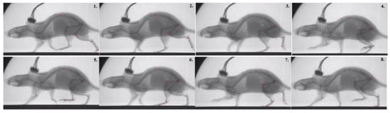 Images from X-ray video recordings of rat walking on a treadmill. Red marks are applied on the mid spine and all joints of a rat left hindlimb in order to track joint motion.