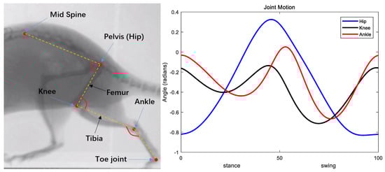 Rat left hindlimb schematic and joint motion. The ankle and the knee motion rhythms are similar, but the timing and the magnitude are different.