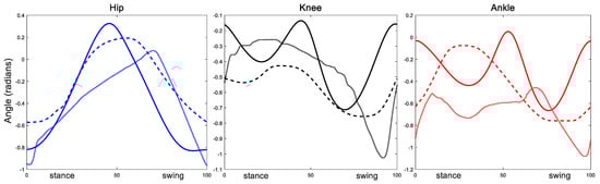 Comparison of animal joint motion profiles with simulation results. Animal data (solid lines); simulation results from this present work with the knee–ankle synergy (dashed lines); simulation results from our previous model [8] (dotted lines) with separate hip, knee and ankle pattern formation circuits.