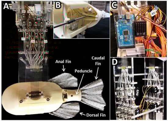 (A) The peduncle, dorsal, anal and caudal fin (PDAC) robot and support structure. (B) The position of the dorsal fin can be adjusted by turning a threaded rod. (C) Servomotors are controlled using a microcontroller. (D) Fin rays are driven by servos via tendons that travel through reinforced nylon conduit.