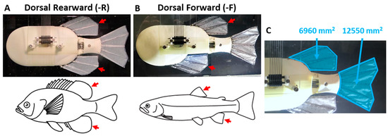 (A) PDAC robot in the dorsal-rearward and (B) dorsal-forward configurations, corresponding to the median fin geometries of the sunfish and trout, respectively. Experiments were conducted with the robot positioned upside-down to allow the body, dorsal and caudal fins to be filmed through the transparent bottom of the tank. (C) The dorsal and anal fins are shaped identically and each of them are 55% of the area of the caudal fin.