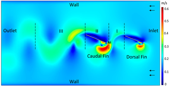 Numerical simulations were conducted to visualize flow and calculate forces as the relative phase difference between the fins was varied (Figure 3). The turbulent k-Ɛ model with Reynolds-averaged Navier–Stokes (RANS) formulation was used for the model [47]. The dorsal fin and the caudal fin were flapped in the rectangular 2D tank with a simple sinusoidal trajectory with a frequency of 1 Hz and amplitude of ±22° in a 200 mm/s inflow (0.43 BL/s). Simulations were conducted at the following phase difference values: −180°, −165°, −160°, −135°, −105°, −90°, −45°, −20°, −10°, 0°, 20°, 45°, 90°, 135°, 158°, 170°, and 180°. The slight inconsistency in the phase difference values was due to the way the phase was determined by the COMSOL software. To better understand flow dynamics, the simulated environment was examined at three different locations: the dorsal fin wake, flow around the caudal fin, and the wake shed by caudal fin (Figure 3).