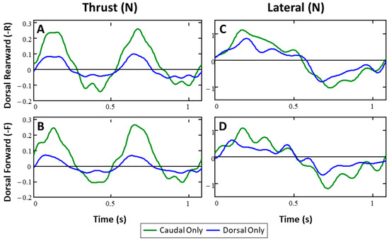 (A,B) Thrust forces for dorsal-rearward and dorsal-forward configurations, respectively. (C,D) Lateral forces for dorsal-rearward and dorsal-forward configurations, respectively, from caudal and dorsal fins operated alone are characteristic of flexible fin rayed fins.