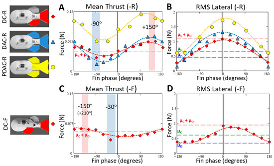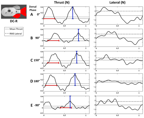 In addition to having significant effect on the mean thrust and RMS lateral forces, varying the phase of the fins caused considerable changes to the shape of the time-varying thrust and lateral forces. The pattern of change was similar for each of the three fin configurations. Pulses of thrust and drag during each fin beat were sharpest and had the greatest magnitude when the dorsal phase lead was near 0° and 180°, and became flatter and decreased in magnitude as the phase lead increased toward 90° and 270° (−90°) (Figure 5). In the following Section 3.3.1, details are provided for the dorsal and caudal configuration (DC) with subsequent sections describing the differences for the DAC and PDAC configurations and the forces from the 2D, thrust vs. lateral perspective (Section 3.3.2 and Section 3.3.3, respectively).