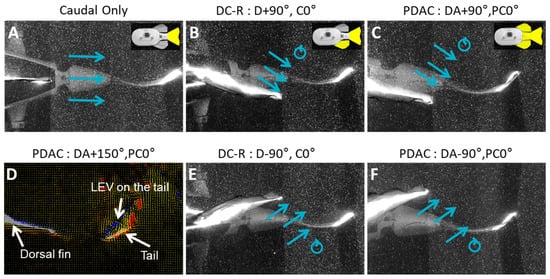 The robot was tested in a flow tank so that propulsive forces and flows could be measured at steady swimming speeds. The robot was positioned upside-down to allow the flow surrounding the body, dorsal and caudal fins to be observed through the transparent bottom of the tank (Figure 2A). Two high-speed cameras (Photron FASTCAM, Photron USA, Inc., San Diego, CA, USA) were positioned to capture the lateral and dorsal views of the robot simultaneously with the force measurements. Raw videos were captured at 500 fps at a resolution of 1024 × 1024 pixels. Hydrodynamic wakes produced by the PDAC robot were studied using digital particle image velocimetry (DPIV), as in previous research [5,6,29,34,41,42]. The laser-excited light sheet was projected orthogonal to the plane of the caudal fin and aligned with the region where the dorsal shed wake would interact with the caudal fin (Figure 2A,B). Captured images of the generated wake flow patterns were compared to in vivo wake flows from previous experiments [5,6,38].