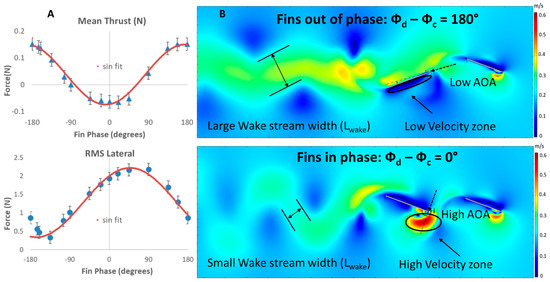(A) Mean thrust and root mean square (RMS) lateral forces produced by simulated dorsal and caudal fins as the phase difference between the fins is varied. (B) Numerical simulations of flow when fins are out-of-phase (180°) vs. in-phase (0°). Appropriate timing of the caudal fin relative to the dorsal fin leads to a lower angle of attack (AOA) experienced by the caudal fin with a faster and larger wake stream that persists farther downstream.