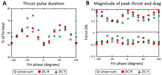 When the dorsal and caudal fins were flapped in phase (ϴ = 0), the thrust forces (T(t)) had a similar shape to the forces produced by single fins, but with larger amplitudes (Figure 4A,B). During each half of the fin beat, the fins produced a steep, large amplitude pulse of thrust followed by a lower amplitude drag pulse (Figure 6A). The durations of the thrust and drag pulses were nearly equal, with thrust being produced during half of the fin beat (Figure 6A).
