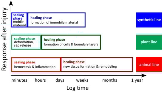 In this overview, we restrict the self-repair of living nature to the self-sealing and self-healing mechanisms found in multicellular organisms. Although regeneration in terms of the regrowth of entire organs offers fascinating insights into nature, the exact means of activating regeneration in plants and animals are not detailed in this context, since the functional principles of the dedifferentiation of cells or the “freezing” of a state of developmental youth [] are not suitable as role models for artificial self-repairing materials. This aspect is different from the self-repair mechanisms that occur in many higher plants and animals and that have recently proved to serve as suitable idea providers and concept generators. In general, self-repair mechanisms in higher animals and plants can be subdivided into an initial self-sealing phase and a subsequent self-healing phase (Table 1). Rapid self-sealing leads to a remaining injury (i.e., fissure, rupture, cut, crack) that is repaired functionally to such an extent that it can fulfil the previous function (e.g., tightness, self-cleaning), although the mechanical properties (e.g., stiffness, strength) are not completely restored. In contrast, the injury is structurally repaired after a long-lasting self-healing phase and is therefore no longer present. Additionally, the mechanical properties of healed materials are (at least partially) restored. Interestingly, this subdivision also holds true for both natural and man-made self-repairing materials systems [,,,]. With regard to biological models, plants and animals have been established as representing materials systems that are built up hierarchically. Thus, initial self-sealing and subsequent self-healing can take place individually at each hierarchical level or can be the result of overarching mechanisms at different levels, whereby the respective level components may be functionally redundant at other levels, may support one another or may combine supposedly conflicting functions [,]. The potential for efficient self-repair also depends on the contrasting specific system properties in plants, which are characterized by continuous growth and those in animals whose development is completed with sexual maturity [,]. Among others, the multitude of hierarchical levels with their diverse structures and components and the differences in their system characteristics have revealed that plants and animals have developed different self-repair mechanisms during biological evolution. Remarkably, a common pattern of self-repair can be observed in higher plants and animals [,] and in artificial self-repairing materials. Even if the time spans and mechanisms are different, all systems involve an initial self-sealing phase that leads to rapid wound or damage closure distinguishable from a later self-healing phase that leads to the most precise possible restoration of the initial state (Figure 1).