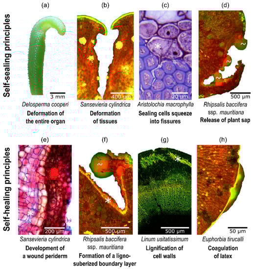 Figure 2 shows some selected examples of self-repair mechanisms in vascular plants. Self-sealing is mainly based on physical reactions and leads to a functional repair of the fissures that are still present (e.g., superficial wound closure, covering of inner and outer wound surfaces). Self-sealing can occur within a few minutes via the discharge of plant saps (e.g., latex, resin, mucilage) that fill and seal the gap and/or within minutes to hours via mechanically driven deformation bringing together the wound edges (e.g., overlapping of wound sites, close contact of wound surfaces, rolling-in of wound edges). Self-healing is mainly based on chemical reactions and biological responses leading to a structural repair of the fissures that are then no longer present (regaining mechanical properties, defense mechanism). Self-healing is in general related to the formation of a (ligno-) suberized boundary layer, to the development of a wound periderm that induces cell division lasting from several days to weeks and in the case of latex-bearing plants, to the coagulation of latex within minutes [,,].