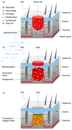 Human wound reaction after a full-thickness skin wounding first shows a hemostasis and inflammation phase that begins with the injury and lasts up to 2–5 day after the injury, followed by a proliferation and maturation phase that lasts for 5 days to 2 weeks after injury and then enters the phase of remodeling (1–12 months after injury) (Figure 3). Immediately after an injury, vascular endothelial cells vasoconstrict to prevent further blood loss. The wounds are sealed by blood clotting. The clot attracts inflammatory (e.g., neutrophils) and repair cells and releases cytokines that initiate the inflammatory response. Macrophages clear the wound of pathogens and dead cells to prevent infection. Additionally, fibroblasts and endothelial cells present on the margins of the wound are activated. The subsequent proliferation stage starts with the formation of granulation tissue bridging the gap between the wound margins. In the maturation stage (epithelialization), the deposition of temporary extracellular matrix and the formation of blood vessels (angiogenesis) occur. Moreover, some fibroblasts differentiate into myofibroblasts, which are contractile cells that approach the wound edges. Fibroblasts and myofibroblasts produce an extracellular matrix, composed mainly of collagen, which forms the bulk of the scar. The healing phase is completed with the remodeling stage, during which most cells undergo programmed cell death (apoptosis). This preserves the extracellular matrix consisting of a few remaining cells but mostly of collagen and other extracellular proteins. The immature collagen fibers are replaced by mature collagen fibers. The consequent cross-linking of the mature collagen fibers results in a strengthening of the repaired tissue (e.g., scar formation). Nevertheless, the repaired tissue never regains the original properties and structure of intact skin, because of the changes in its fiber architecture [,,,].