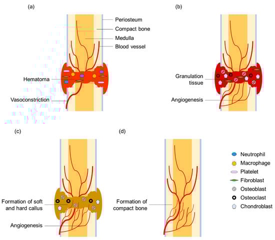 Phases of indirect (secondary) healing after bone fracture in humans. (a,b) Reaction involving (a) hemostasis, inflammation and (b) granulation tissue formation; (c) repair involving the formation of cartilage callus and lamellar bone deposition; and (d) remodeling (restoration of the original bone contour without scar formation).