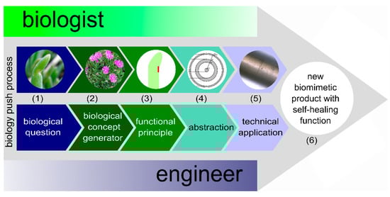 Even a simple observation in nature can lead to a targeted transfer of the inspiring idea and thus to the development of a bioinspired material with self-repair function. Based on further systematic investigations of the biological role model, the underlying functional principles of the self-repair function can be decoded and finally transferred to technical applications. Irrespective of the chosen approach, learning from biological solutions for technical applications always requires a wide interdisciplinary cooperation of scientists such as biologists, chemists, physicists, mathematicians, materials scientists, designers, architects and engineers. However, the basic prerequisites for the transfer of biological insights into technical developments are the common physical, chemical and mathematical laws existing in both biology and technology. Based on this common framework, a systematic and stepwise approach can be applied that differs less in the type of steps than in the type of knowledge transferred (e.g., the transfer of an idea, a functional principle, the morphology or the application of a biomimetic algorithm) []. The biologically inspired design [,] and the biomimetic approach [,,] belong to the best-known and most used methods.
