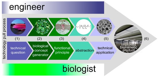 The top-down approach is a stepwise development starting with a question from the engineering sciences for solving a technical challenge. Therefore, the top-down approach is sometimes also called the technology pull process. The bottom-up approach is also a systematic stepwise developmental process but with the difference that it starts with a question from biology for understanding biological systems. For this reason, the bottom-up approach is also known as the biology push process. As the two biomimetic approaches differ essentially in the first step, whereas the following steps differ only in a few details, they are presented together in Table 4 in which the individual steps and a brief description of each single step are given. Even if the biomimetic approaches are represented as linear processes in Table 4, and in Figure 5 and Figure 6; biomimetics is a highly dynamic and interdisciplinary heuristic spiral that can include several feedback loops. In addition, within each biomimetic approach, not only is a technical application created but also an in-depth understanding of the form–structure–function relationship of the selected biological models occurs, a knowledge gain that is coined as reverse biomimetics []. At this point, the going well beyond biology concept should also be addressed []. On the one hand, the biomimetic solution can be combined from several role models, even from the plant and animal kingdoms, which do not occur together in nature. On the other hand, the biomimetic technical system can be used in environments where biological systems would clearly fail and/or further functionalities that do not exist in living nature may be added to fulfil the desired final function of the technical application.