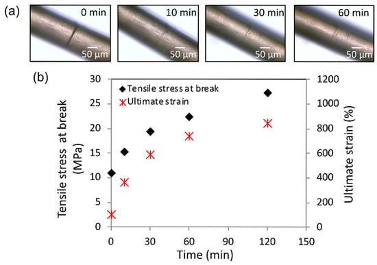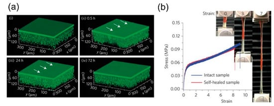 Self-healing of microphase-separated cold-drawing programmed polyurethane (PURP) fibers. (a) Optical images of PURP fiber. (b) Tensile stress at break and ultimate strain plotted as a function of healing time. Undamaged samples have an ultimate strain of 1015% and a tensile stress at break of 29.2 MPa. Values are the average of N = 6. Reprinted from [], Copyright 2018, with permission from Elsevier.