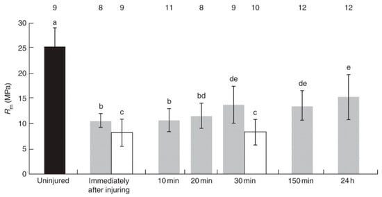 Vascular plants (tracheophytes), which are typically sessile and therefore cannot escape from unfavorable environmental conditions, have evolved a variety of morphological, anatomical and biochemical adaptations to survive (sometimes severe) disturbances. These evolutionary traits include self-repair and defense mechanisms as reactions to injuries of various kinds. Pure mechanical damages may occur by the trampling or feeding animals, rock falls, falling plant organs or other air-borne parts and overcritical bending or twisting in strong storms []. A combination of mechanical damage and chemical attack can be assumed after insect herbivory. In the latter case, plants respond by direct defense, namely affecting the physiology and/or behavior of the attacking insects and by indirect defense, such as the attraction of natural enemies of the herbivores [,]. The current review will focus on mechanically driven wound reactions of plants characterized by their specific bauplans. In connection with self-repair in vascular plants, the following three aspects are of particular interest. First, plants are described as open systems, characterized by the permanent presence of “embryonic” stem cells in the growth zones (e.g., vegetation points, cambia). This enables plants continuously to grow and form new organs until death [,]. Second, in vascular plants, at least five hierarchical levels can be found from the macroscale to the nanoscale: (i) organs (e.g., roots, leaves, stems); (ii) tissues (dermal, ground and vascular tissue); (iii) cells (e.g., parenchyma cells, vessels, fibers, laticifers); (iv) organelles (e.g., nucleus, chloroplasts, mitochondria); and (v) molecules (e.g., cellulose, hemicellulose, pectin, lignin, latex) [,]. Hierarchical structuring offers the potential to achieve self-repair at each single level or by the combination of several levels whereby every single level can promote the self-repair function or even solve conflicting functional requirements []. Third, during self-repair processes in all the plant species investigated so far, an initial rapid self-sealing phase and subsequent long-term self-healing phase can be discerned (Figure 1) [,,].