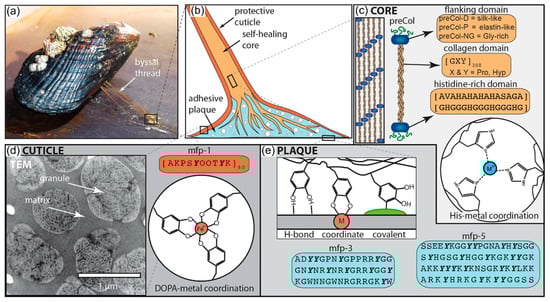 - Harrington, M.J.; Jehle, F.; Priemel, T. Mussel byssus structure-function and fabrication as inspiration for biotechnological production of advanced materials. Biotechnol. J. 2018, 1800133. [Google Scholar] [CrossRef]