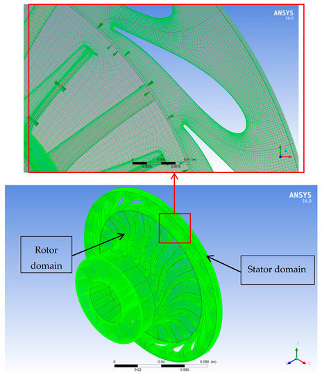 The structured (hexahedron) meshes for both the rotor and stator flow passages were generated using ANSYS Turbo-Grid (version 16.0). Automatic topology and meshing (ATM-optimized) was adjusted for the rotor and nozzle domains to maintain high mesh quality as blade shape changes from hub to shroud. The element size refinement was controlled in the boundary layer by selecting the method proportional to mesh size with a setting factor base and factor ratio of 0 and 1.6 respectively, to ensure the meshes able to capture the turbulent flow structures and the boundary layer effects near the walls. A turbulence model chosen was standard k–ω to capture the turbulence phenomena. The nondimensional grid spacing (y+) at the wall is required to be near 1.0 for the k–ω standard turbulence model; however, the typical value of y+ at the rotor blade was 9.8 in case of air. Subsequently, the option of automatic wall functions was chosen, which allows the k–ω model to obtain good predictions albeit the value of y+ is larger than 1.0. The total number of elements for the rotor and nozzle mesh was 3,272,048 and 4,272,122 elements, respectively. The 10 layers of elements were inserted in the shroud tip clearance of 0.23 mm in radial direction to 0.4 mm in axial direction. The computational meshes for the rotor and stator domains used for the validation of the CFD model are shown in Figure 4.