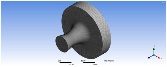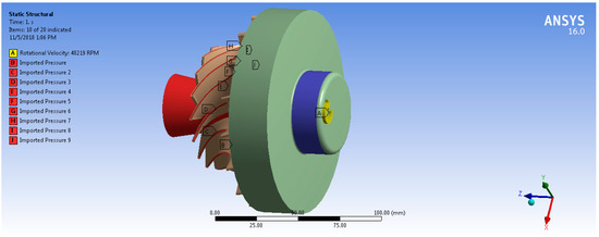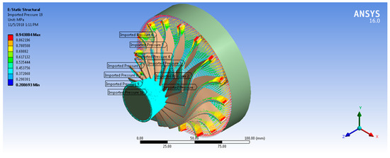 Fluid–structure interaction can be considered as the result of the mutual interaction of three main disciplines: dynamics, solid mechanics, and aerodynamics [18]. The one-way FSI system was used in this analysis. For the static structural analysis, the boundary conditions and loads are defined for the model in order to determine the stresses and deflections in the turbine. These loads are caused by the temperature and pressure of the working fluid, and turbine rotational speed. Based on Ansys-CFX simulation results, the aerodynamic pressure force on the rotor blades and thermal loads due to working fluid temperature are transferred to a static structural model and solved for equivalent von Mises stress and total deformation. Therefore, ANSYS is mapping the forces on each node from CFX into the mechanical node. Consequently, the position of the blade geometry in CFX module and Static Structural module must be same with reference to the global coordinate system. The results showed that 97% of mechanical nodes were mapped to the CFD surface. Both Figure 11 and Figure 12 show the imported pressure and temperature distributions on the rotor and the hub wheel from CFX into the static structural model. In order to model the centrifugal stresses, the rotational speed and the cylindrical support were applied on the wheel hub as shown in Figure 13. The rotational turbine speed was 40,219 rpm as indicated in Table 1. The cylindrical support limits the motion of the turbine wheel in the radial and axial directions and it is free in the tangential direction.