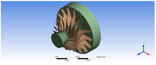 The 3D model was generated in ANSYS Blade-Gen (version 16.0) based upon published geometrical information [16]. The rotor and stator blade profiles, including the wrap angle, blade angle, and blade thickness through its meridional axis, were used to define a solid model for the rotor and the stator blades. Figure 3 shows the final 3D model of the radial inflow turbine which consists of 16 rotor blades and 19 stator blades.