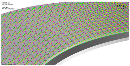 ANSYS Composite Pre/Post (ACP) was used to assign the composite materials to the rotor blades. Epoxy carbon UD (unidirectional) prepreg was selected for the composite rotor blades because its glass transition temperature around 120 °C, which is below the inlet turbine temperature of 97 °C. Table 2 shows the properties of the materials used in modeling the turbine. An ACP composite model of the bird-mimetic composite blade is shown in Figure 9. The reference direction for the composite material was considered parallel to the blade edge which is indicated by yellow arrows, the fiber direction from the reference is indicated by green arrows, and the composite layup direction is indicated by pink arrows. The turbine consists of 16 rotor blades and each blade has been modeled with 0.5 mm of turbine material on each side of the blade, pressure side and suction side. Figure 10 shows the composite material model of the blade with different fiber orientations 30°, 40°, 50°, and 60° from the blade root section.